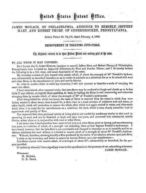 Improvement in Treating Jute-Fibre, US00074113, Monach, James, February 4, 1869, 1 page. Posted September 12, 2004. CD (HWDA10). SAMPLE PAGE. File size 456 KB PDF