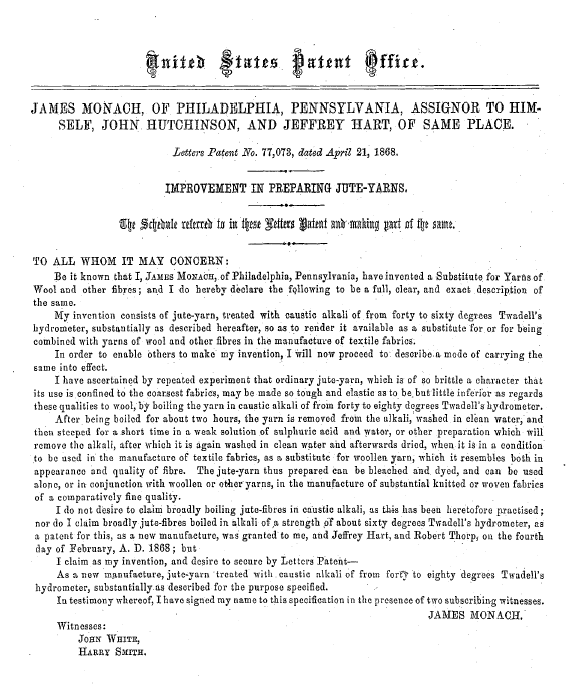 Improvement in Preparing Jute-Yarns, US00077073, Monach, James, April 21, 1868, 1 page. Posted September 12, 2004. CD (HWDA10). SAMPLE PAGE. File size 444 KB PDF