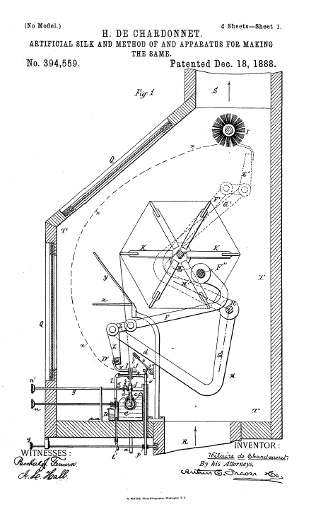 Artificial Silk and Moethod of and Apparatus for Making the Same, US00394559, de Chardonnet, H., December 18, 1888, 9 pages. Posted June 15, 2004. SAMPLE PAGE. File size 1 MB PDF