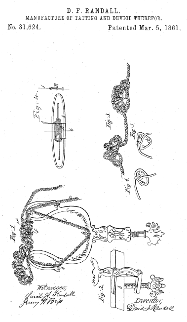 Manufacture of Tatting and Device Therefor, US00031624, Randall, David F., March 5, 1861, 3 pages. Posted September 20, 2002. CD (HWDA10). SAMPLE PAGE. File size 587 KB PDF