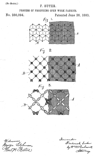 Process of Producing Open Work Fabrics, US00280094, Suter, Frederick, May 26, 1883, 2 pages. Posted September 20, 2002. CD (HWDA10). SAMPLE PAGE. File size 500 KB PDF