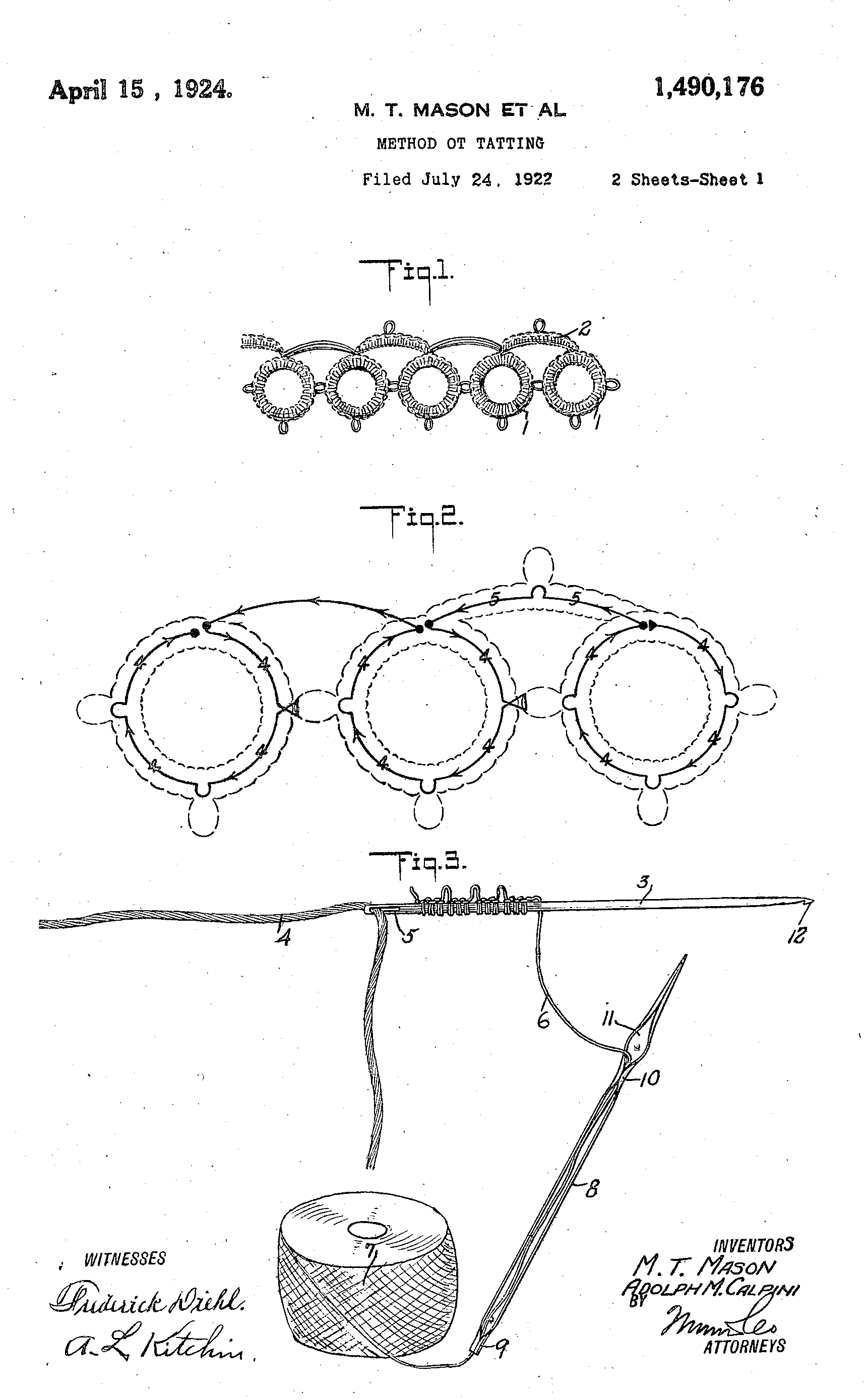 Method of Tatting, US01490176, Mason, M. T. et al, August 22, 1922, 4 pages. Posted October 30, 2002. CD (HWDA10). SAMPLE PAGE. File size 767 KB PDF