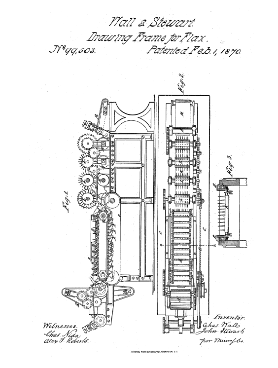 Drawing Frame for Flax, US00099503, Wall, Charles and John Stewart, February 1, 1870, 2 pages. Posted September 13, 2004. CD (HWDA10). SAMPLE PAGE. File size 544 KB PDF
