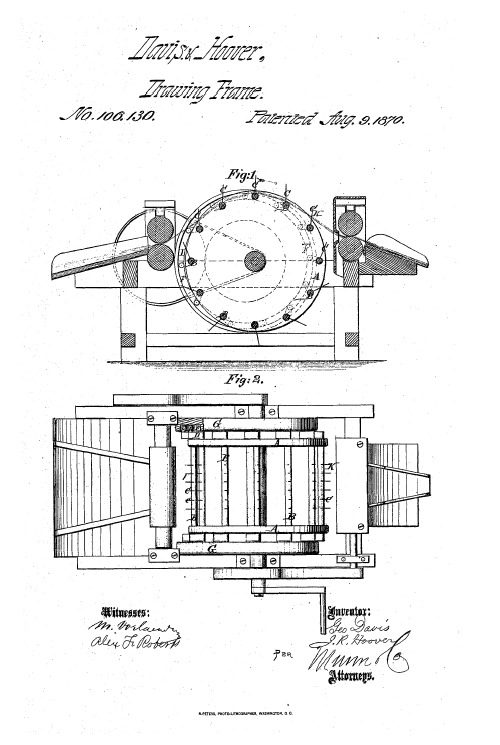 Drawing Frame, US00106130, Davis, George and John F. Hoover, August 9, 1870, 2 pages. Posted September 13, 2004. CD (HWDA10). SAMPLE PAGE. File size 524 KB PDF
