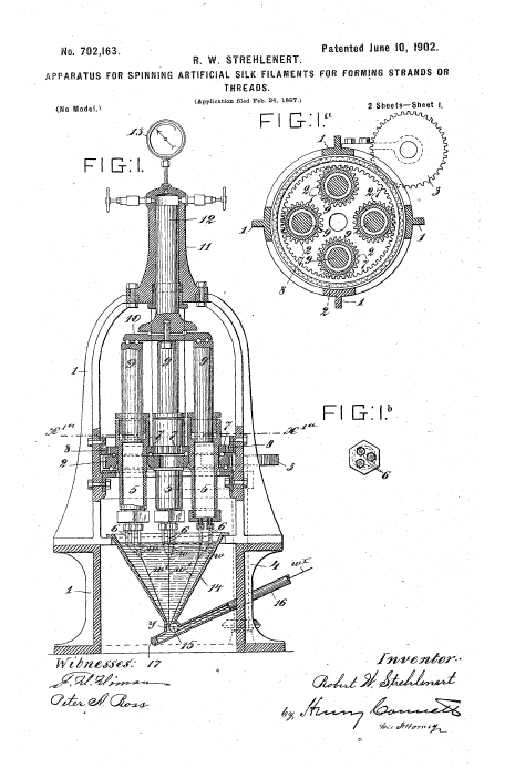 Apparatus for Spinning Artificial Silk Filaments for Forming Strands or Threads, US00702163, Strenlenert, R. W., June 10, 1902, 5 pages. Posted January 17, 2005. SAMPLE PAGE. File size 784 KB PDF