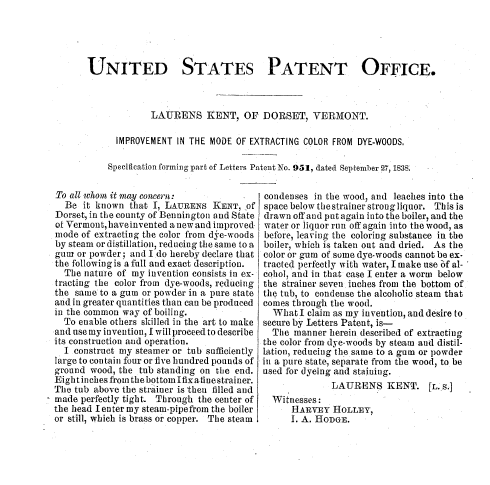 Improvement in the Mode of Extracting Color from Dye-Woods, US00000951, Kent, Laurens, September 27, 1838, 1 page. Posted December 1, 2004. SAMPLE PAGE. File size 448 KB PDF
