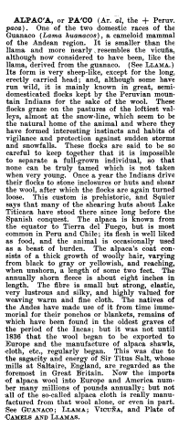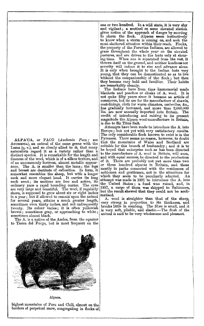 Alpaca, ---. Chambers's Encyclopedia, 1881, 1 page. Posted January 23, 2004. SAMPLE PAGE. File size 516 KB PDF