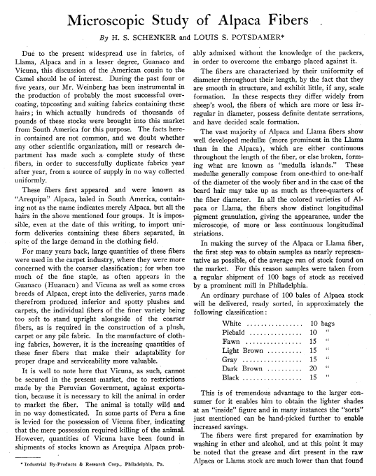 Microscopic Study of Alpaca Fibers, Schenker, H. S. and Louis S. Potsdamer. The Melliand, Vol. 3, No. 4 (July 1931), 3 pages. Posted November 18, 2002. SAMPLE PAGE. File size 1.5 MB PDF