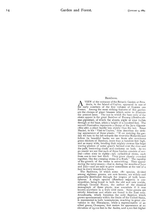 Bamboos, ---. Garden and Forest, Vol. 2 No. 46 (January 1889), 2 pages. Posted March 6, 2005. CD (HWDA12). SAMPLE PAGE. File size 484 KB PDF