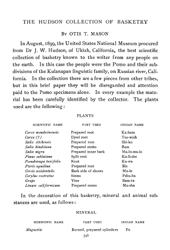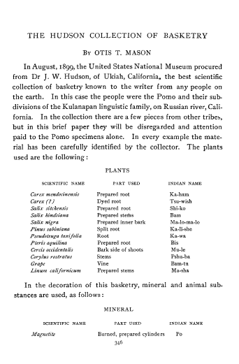 Hudson Collection of Basketry, Mason, Otis T. American Anthropologist, Vol. 2 (1900), 8 pages. Posted June 20, 2004. CD (HWDA10). SAMPLE PAGE. File size 812 KB PDF