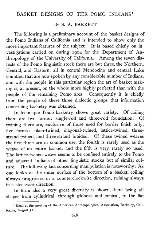 Basket Designs of the Pomo Indians, Barrett, S.A. American Anthropologist, Vol. 7 No 4 (1905), 8 pages. Posted December 17, 2006. SAMPLE PAGE. File size 1.5 MB PDF