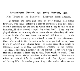 Half-Timers in Factories, Chesser. Elizabeth Sloan. Westminster Review, Vol. 172, 1909, 4 pages. Note: From "Selected Articles on Child Labor", Debater's Handbook Series, 1911. Posted October 22, 2003. CD (HWDA07). SAMPLE PAGE. File size 540 KB PDF