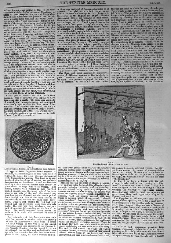 Society of Arts Lectures. Egyptian Tapestry, Cole, Alan S. Textile Mercury, 1889, 1 page. Note: digital photograph. Posted June 20, 2006. SAMPLE PAGE. File size 344 KB PDF