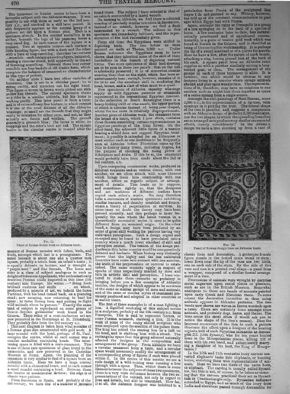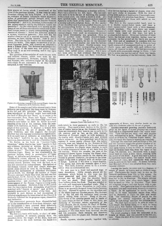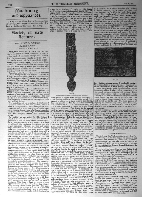 Society of Arts Lectures. Egyptian Tapestry, Cole, Alan S. Textile Mercury, 1889, 3 pages. Note: digital photograph. Posted June 20, 2006. SAMPLE PAGE. File size 984 KB PDF