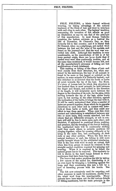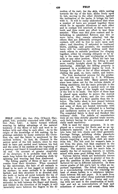 Felt, Felting, ---. Chambers's Encyclopedia Supplement, 1881, 2 pages. Posted February 7, 2004. SAMPLE PAGE. File size 528 KB PDF