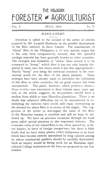 Manila Hemp, ---. Hawaiian Forester and Agriculturalist, Vol. 1 , No. 7 (July 904), 1 page. Posted November 5, 2004. CD (HWDA11). SAMPLE PAGE. File size 436 KB PDF
