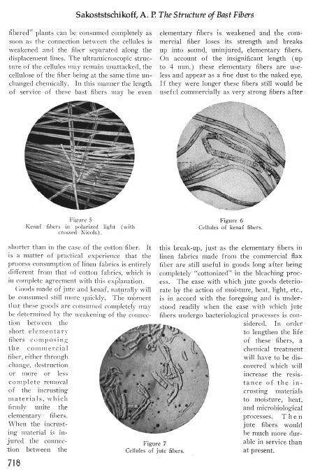 Structure of Bast Fiber, Sakostschikoff, A. P. The Melliand, Vol. 1, No. 5 (August 1929), 3 pages. Posted October 4, 2002. SAMPLE PAGE. File size 996 KB PDF