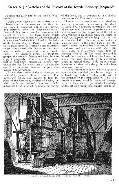Sketches from the History of the Textile Industry: Jacquard, Keiser, A. J. The Melliand, Vol. 1, No. 2 (May 1929), 5 pages. Posted February 10, 2002. SAMPLE PAGE. File size 1.1 MB PDF
