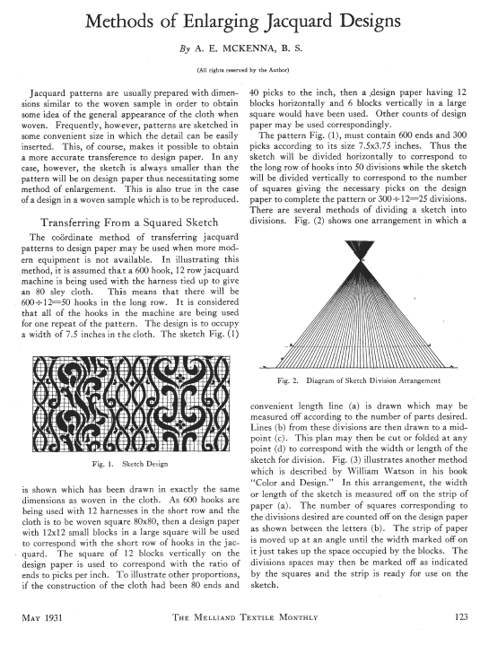 Methods of Enlarging Jacquard Patterns, McKenna, M. A. The Melliand, Vol. 3, No. 2 (May 1931), 6 pages. Posted November 18, 2002. SAMPLE PAGE. File size 2.4 MB PDF