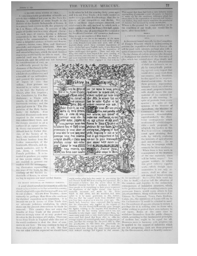 A Prayer Book Woven in Silk, ---. Textile Mercury , Vol. 4 (1891), 2 pages. Note: Digital photography. Posted August 1, 2006. SAMPLE PAGE. File size 1.99 MB PDF