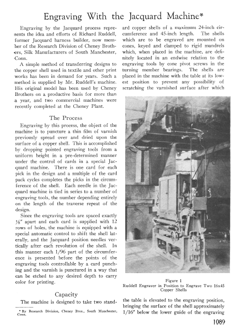 Engraving with Jacquard Machines, ---. The Melliand, Vol. 2, No. 8 (November 1930), 5 pages. Posted October 5, 2002. SAMPLE PAGE. File size 1.6 MB PDF