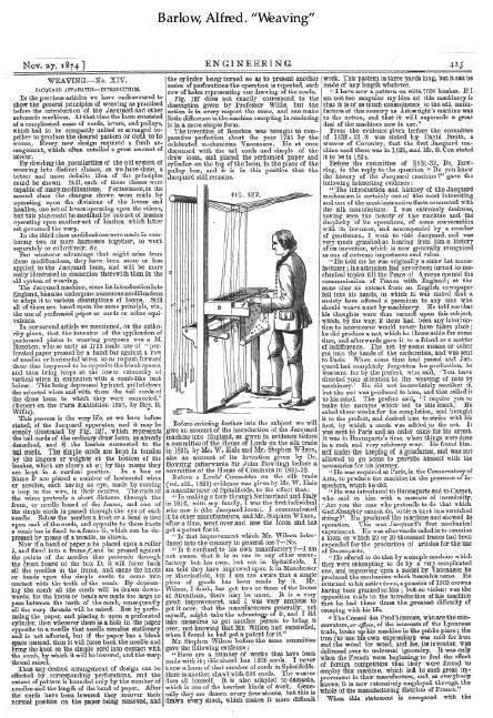 Weaving. -- No. XIV: Jacquard Apparatus -- Introduction, [Barlow, Alfred]. Engineering Weekly, November 27, 1874, 2 pages. Note: Reduced to 85% to fit on printed page. Posted April 9, 2002. SAMPLE PAGE. File size 820 KB PDF