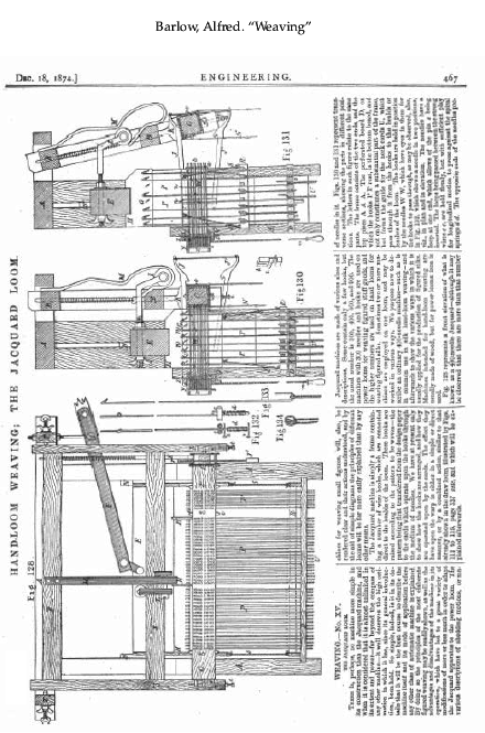 Weaving. -- No. XV: The Jacquard Loom, [Barlow, Alfred]. Engineering Weekly, December 18, 1874, 2 pages. Note: Reduced to 85% to fit on printed page. Posted April 9, 2002. SAMPLE PAGE. File size 804 KB PDF