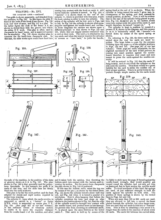 Weaving. -- No. XVI: The Jacquard Loom (continued), [Barlow, Alfred]. Engineering Weekly, January 8, 1875, 3 pages. Note: Reduced to 85% to fit on printed page. Posted March 23, 2003. SAMPLE PAGE. File size 1 MB PDF