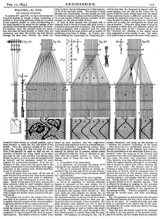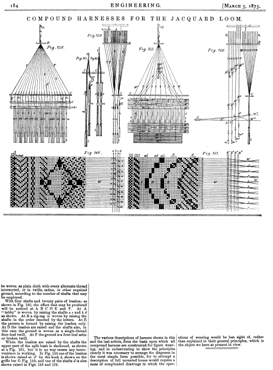 Weaving. -- No. XVIII: The Jacquard Loom -- Compound Harnesses, [Barlow, Alfred]. Engineering Weekly, March 5, 1875, 2 pages. Note: Reduced to 85% to fit on printed page. Posted March 23, 2003. SAMPLE PAGE. File size 960 KB PDF