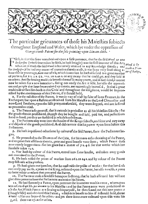 ---. The Particlar Grievances of those his Majesties Subjects throughout England and Wales, which Lie Under the Oppression of George Woods Patent for the Sole Printing upon Linnen cloth, 1621, 1 page. Posted January 5, 2005. SAMPLE PAGE. File size 992 KB PDF