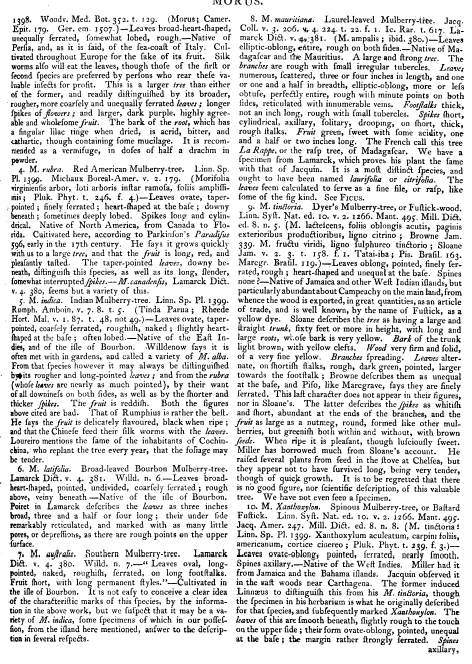 Morus (Mulberry Tree), ---. Rees's Cyclopedia, 1819, 4 pages. Posted October 10, 2003. SAMPLE PAGE. File size 748 KB PDF