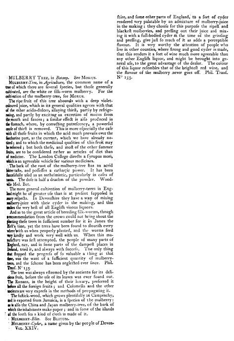 Mulberry, ---. Encyclopedia Britannica, 11th ed., 1911, 1 page. Posted June 23, 2003. SAMPLE PAGE. File size 548 KB PDF