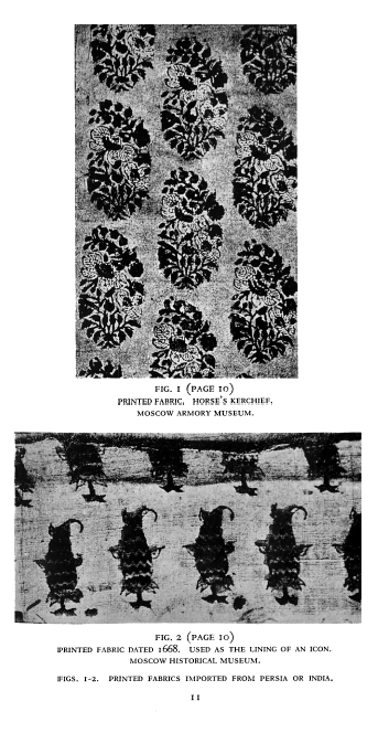 Printed Textiles in Russia, Sobolev, N. and Eugenia Tolmachoff (translator). The Bulletin of the Needle and Bobbin Club, Vol. 24 (1940), 61 pages. Note: Several related articles combined. Posted January 17, 2004. SAMPLE PAGE. File size 5.4 MB PDF