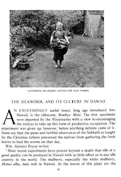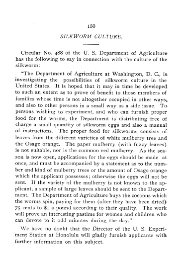 Silkworm Culture, ---. Hawaiian Forester and Agriculturalist, Vol. 1 (1904), 1 page. Posted November 5, 2004. CD (HWDA11). SAMPLE PAGE. File size 444 KB PDF