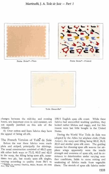 ---. Silk Throwing, Part 3 (Monograph 5002C), International Textbook Co., 1924, 47 pages. Note: Scanned images provided by Tess Parrish. Copyright not renewed. Posted August 11, 2006. SAMPLE PAGE. File size 2.2 MB PDF