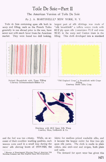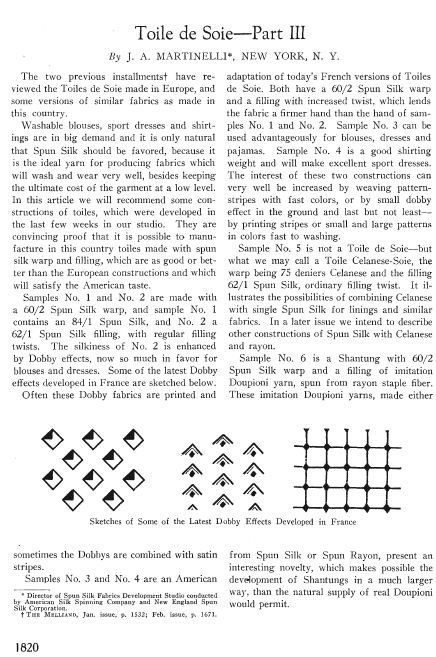 Brickett, C.J. and Luft, Carl A. Silk Testing, Part 2 (Monograph 5001B), International Textbook Co., 1925, 48 pages. Note: Scanned images provided by Tess Parrish. Copyright not renewed. Posted August 11, 2006. SAMPLE PAGE. File size 2.1 MB PDF