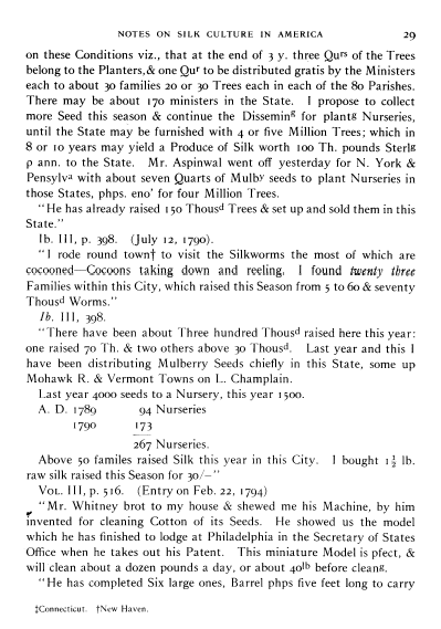 Note of Silk Culture in America in the Eighteenth Century, Stiles, Ezra. The Bulletin of the Needle and Bobbin Club, Vol. 7, No. 2 (1923), 3 pages. Posted September 21, 2003. SAMPLE PAGE. File size 496 KB PDF