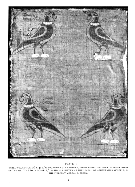 Two Mediaeval Woven Silk Fabrics in the Bindings of the 9th Century MS. The Four Gospels" in the Pierpont Morgan Library, New York City, Elsberg, H. A. The Bulletin of the Needle and Bobbin Club, Vol. 17 (1933), 10 pages. Posted November 20, 2003. SAMPLE PAGE. File size 1.4 MB PDF