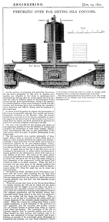 Pneumatic Oven for Drying Silk Cocoons, ---. Engineering Weekly, January 19, 1872, 1 page. Posted March 21, 2003. CD (HWDA08). SAMPLE PAGE. File size 596 KB PDF