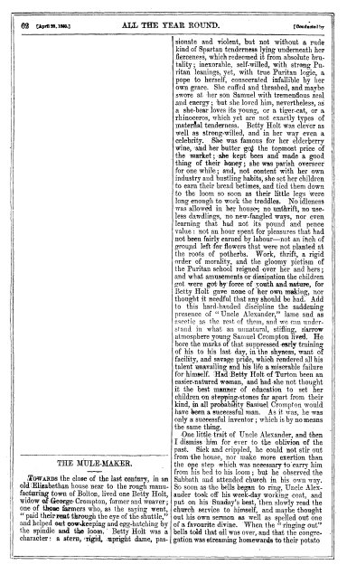 The Mule-Maker, Dickens, Charles. All The Year Round, April 28, 1860, 4 pages. Posted May 7, 2004. CD (HWDA10). SAMPLE PAGE. File size 820 KB PDF