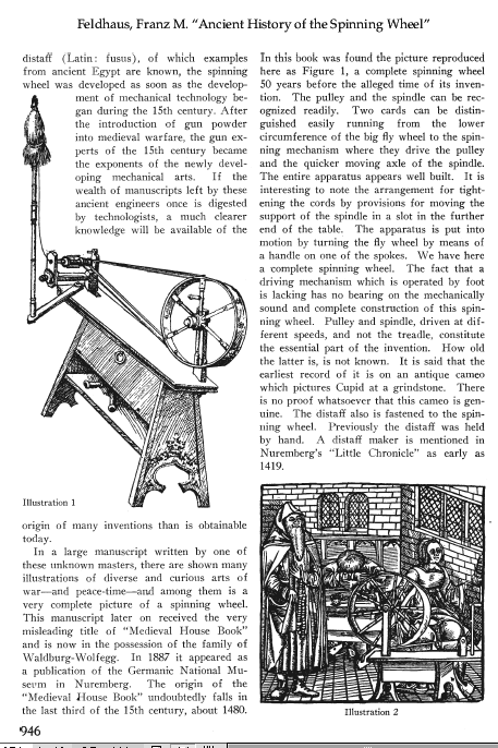 Ancient History of the Spinning Wheel, Feldhaus, F. M. The Melliand, Vol. 1, No. 6 (September 1929), 3 pages. Posted March 5, 2002. SAMPLE PAGE. File size 784 K PDF