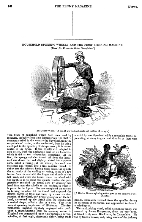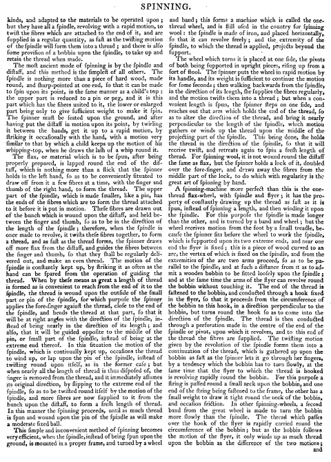 Spinning, ---. Chambers's Encyclopedia, 1881, 3 pages. Posted July 4, 2003. SAMPLE PAGE. File size 760 KB PDF