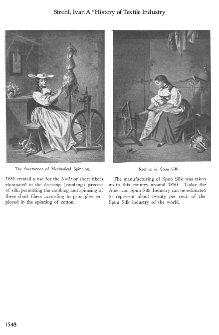 History of Textile Industry -- Spun Silk: Transition from a Home-Industry to Mechanical Spinning, Strohl, Ivan A. The Melliand, Vol. 1, No.10 (January 1930), 3 pages. Posted March 5, 2002. SAMPLE PAGE. File size 756 KB PDF