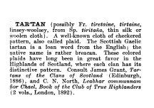Tartan, ---. Encyclopedia Britannica, 11th ed., 1911, 1 page. Posted June 23, 2003. SAMPLE PAGE. File size 528 KB PDF