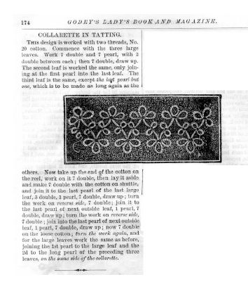 Collarette in Tatting, ---. Godey's Lady's Book and Magazine, Vol. 85 (August 1872), 1 page. Posted December 12, 2003. CD (HWDA07). SAMPLE PAGE. File size 544 KB PDF