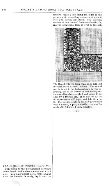Handkerchief Border (Tatting), ---. Godey's Lady's Book and Magazine, Vol. 87 (August 1873), 1 page. Posted December 12, 2003. CD (HWDA07). SAMPLE PAGE. File size 624 KB PDF