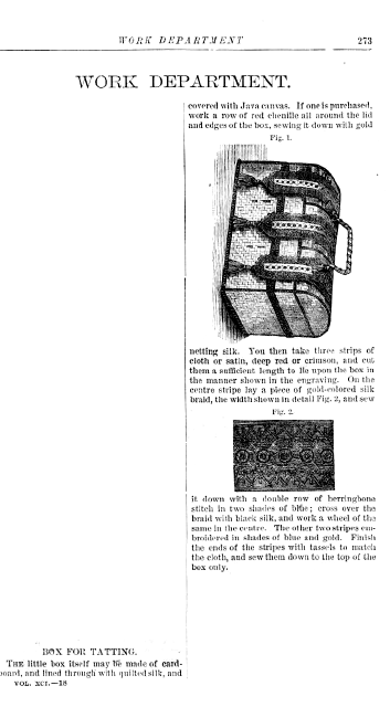 Box for Tatting, ---. Godey's Lady's Book and Magazine, Vol. 91 (September 1875), 1 page. Posted December 12, 2003. CD (HWDA07). SAMPLE PAGE. File size 532 KB PDF