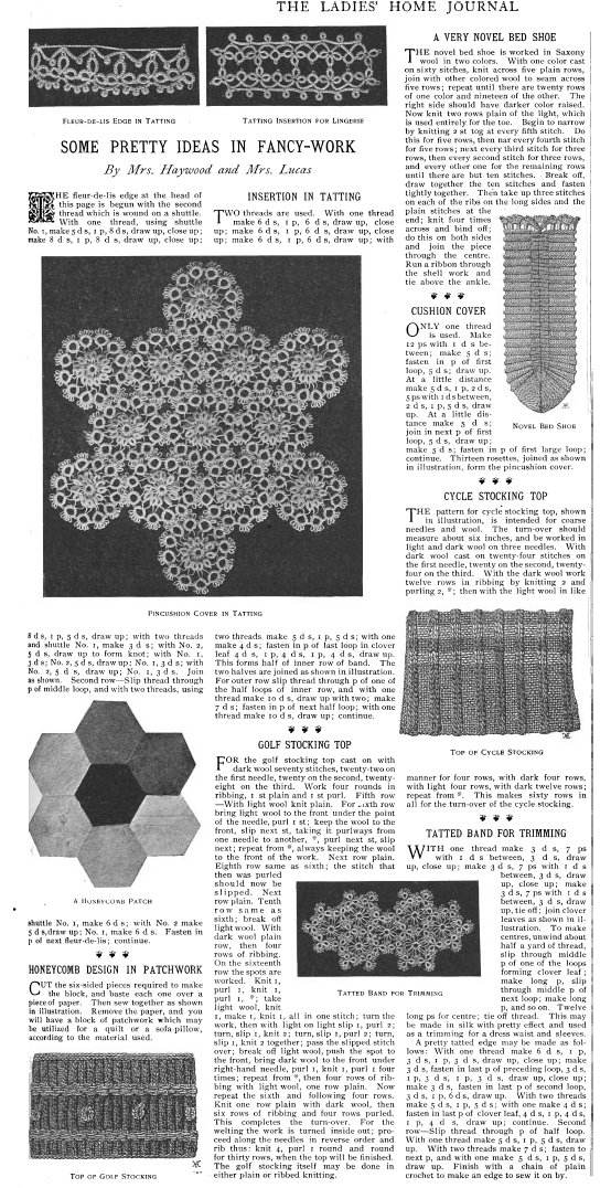 Some Pretty Ideas in Fancy-Work, Haywood and Lucas. Ladies' Home Journal, 1898, 1 page. Posted August 13, 2003. CD (HWDA09). SAMPLE PAGE. File size 216 KB PDF