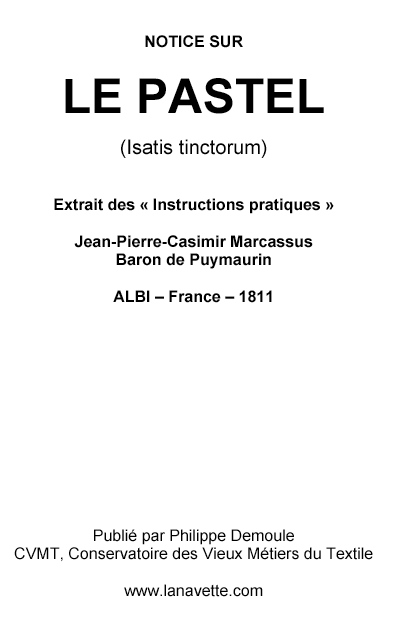 Demoule, Philippe. Notice sur le Pastel (Isatis tinctorem) [Notes on Pastel], 9 pages. Posted May 8, 2002. FIRST PAGE. File size 96 KB PDF