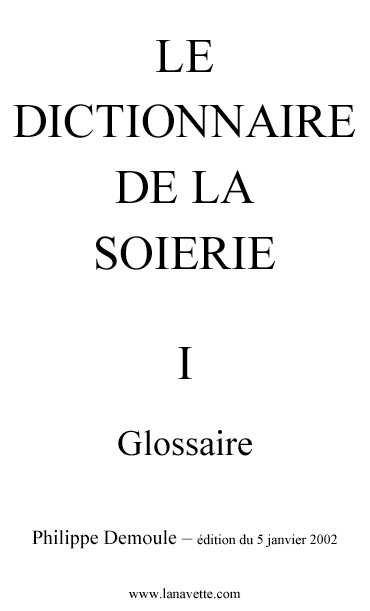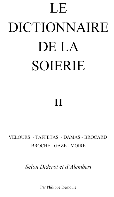 Demoule, Philippe. Le Dictionaire de la Soierie II [Dictionary of Silk Making: Glossary II], 72 pages. Posted May 24, 2002. FIRST PAGE. File size 416 KB PDF